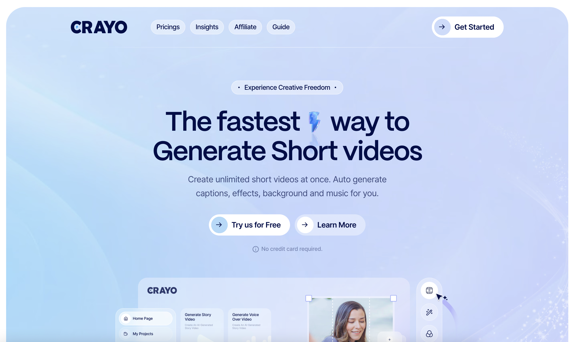 Offers unparalleled creative freedom and efficiency in generating short videos using AI. With Crayo, you can create unlimited short videos in seconds, thanks to its automatic generation of captions, effects, backgrounds, and music. The platform supports various content types, from Reddit stories to TikTok videos, allowing you to cater to different social media platforms like YouTube, Instagram, and TikTok. Crayo's advanced features, such as AI voice narration, script generation, and AI-powered video editing, streamline the video creation process, making it easy to produce professional and engaging content. Join thousands of creators who have already experienced the magic of Crayo and significantly boosted their content output and social media growth. Enjoy a seamless, efficient, and creative video-making process without needing a credit card to get started.